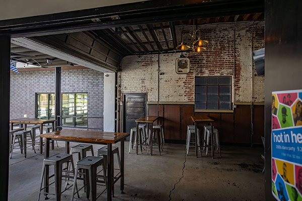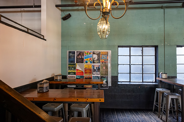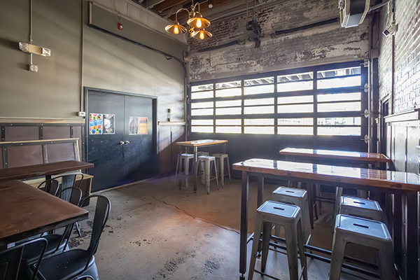 We offer Bay 5 (up to 30 guests, indoor/outdoor), the Mezzanine and Landing (up to 35 guests, indoor), the Music Hall (up to 200 seated guests, 350+ unseated, 3,000 sq ft), and the Veranda, our covered outdoor extension (Showroom rental required).